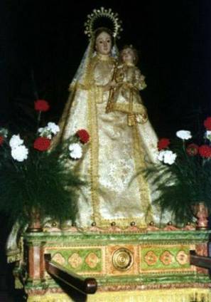 Sorprendido porque en San Sebastián se celebrase su procesión, asistida por sus mayordomos, y en la festividad de la Virgen nisiquiera se celebrase su correspondiente procesión, pregunté a varias señoras del pueblo y mi asombro fué mayusculo cuando descubrí que el motivo no era otro que la falta de alguna persona que la bajase de su altar en el retablo mayor. Tomé manos en el asunto y durante unos años, personalmente y pidiendo escaleras prestadas, bajé a la Virgen de su altar, se la limpió, se la vistió y adornó y salió orgullosa y solemnemente en procesion acompañada de sus Madrinas de Honor. Recuerdo que el primer año era tal la cantidad de polvo que había sobre el pedestal donde se apoya la Virgen que lo tuve que limpiar con un recogedor. LLevaba un traje blanco y se le cambió por uno azul.
