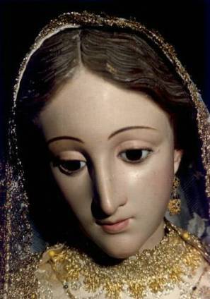 Nuestra Señora de Gracia con un traje color hueso bordado en oro, donado por una Joyanca de corazón y gran devota de la Virgen: Dª ROSARIO VINAROZ BURGUEÑO. Aunque sé que ella ha mantenido y quiere mantener el anonimato sirva esta página como Homenaje por el cariño y el aprecio que la tengo. Por cierto, su difunto marido, D. Manuel Carvajal Serrano que descansa para siempre en el Cementerio de Poyales, era un excelente fotografo y espero que parte de su obra pueda exponerse para disfrute de todos.